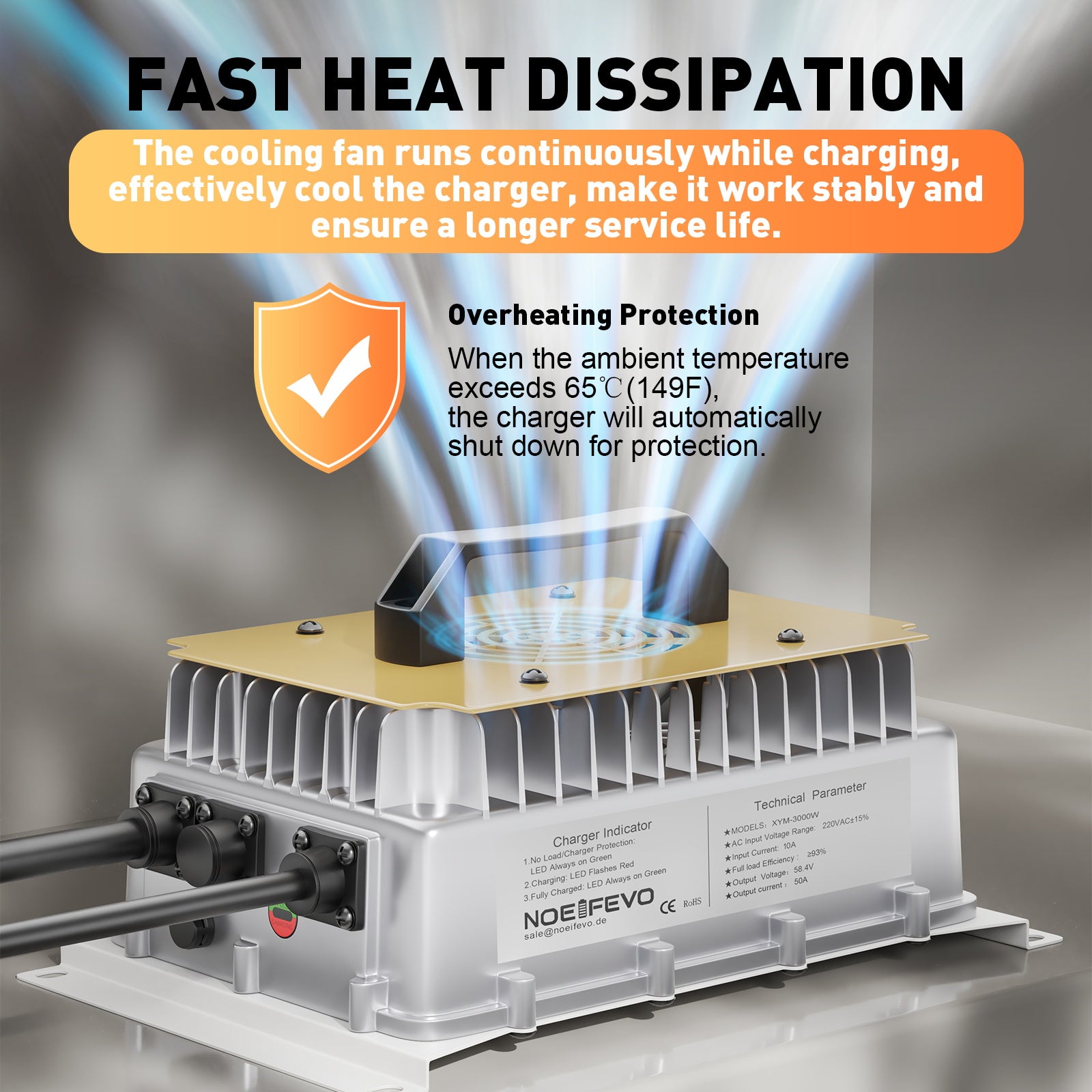 Ładowarka NOEIFEVO przeszła testy odporności na wstrząsy termiczne i wysokie temperatury i może pracować w zakresie temperatur od –18 °C do +45 °C, zapewniając bezpieczną i stabilną pracę.