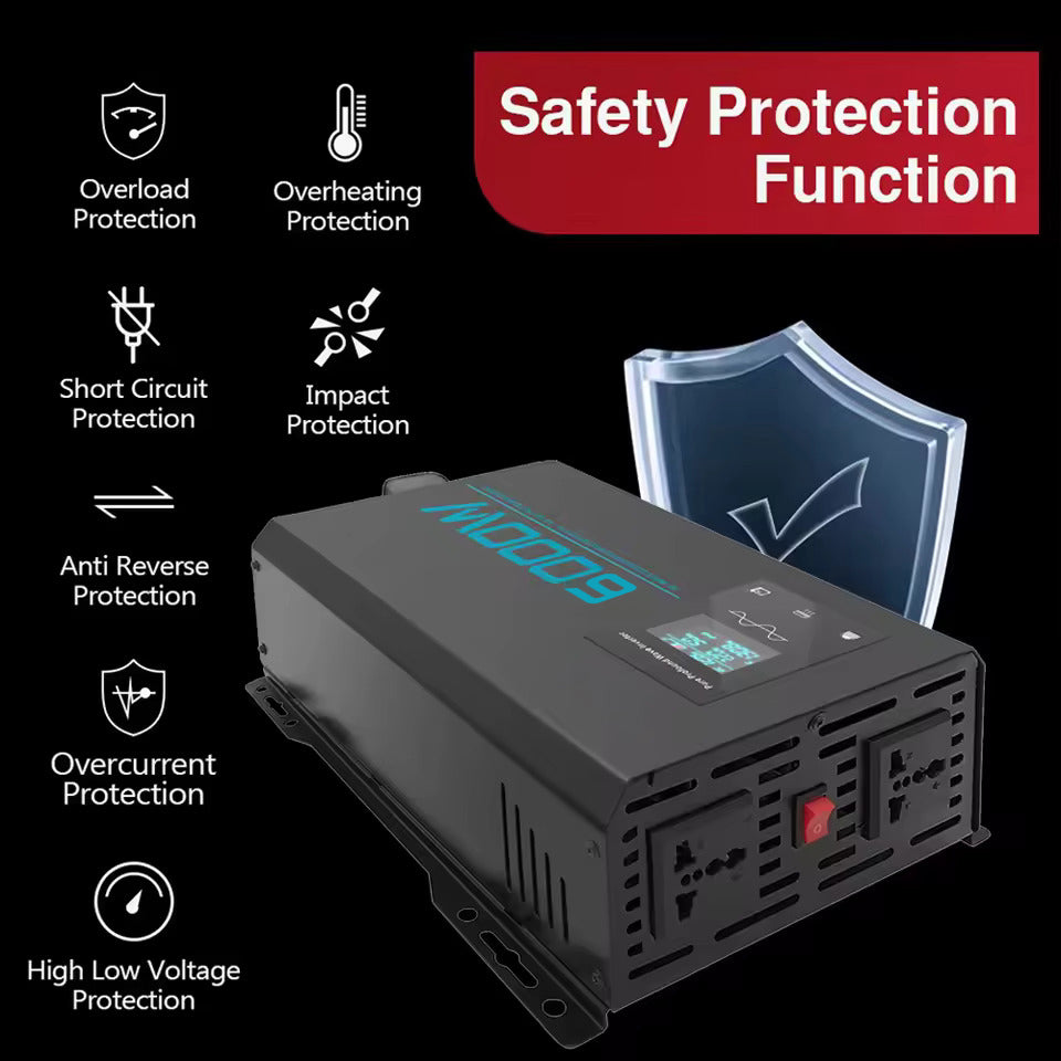 48V, 60V & 72V 6000W – Unterstützt 48V, 60V und 72V DC-Eingang mit einem 220V AC-Ausgang. Spitzenleistung 6000W, Dauerleistung 3000W.